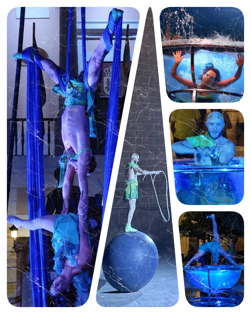 En un mundo donde el mar guarda secretos ancestrales, un arcano Tritón y una enigmática Nereida emergen de las profundidades para invitarnos a un viaje fascinante. Acrobacias, danzas aéreas y destellos de fantasía, transforman el circo en un océano mítico donde los hijos del mar cobran vida y la belleza del mito se funde con la emoción del espectáculo.